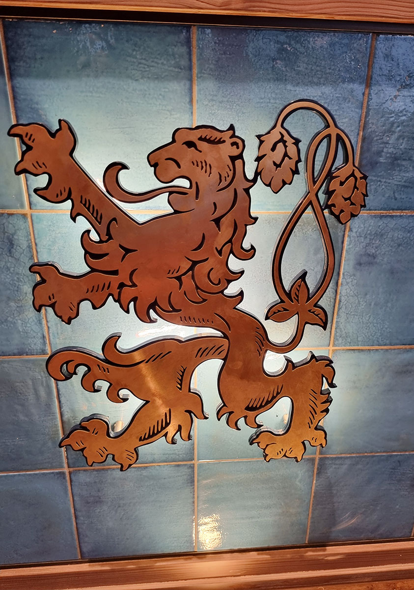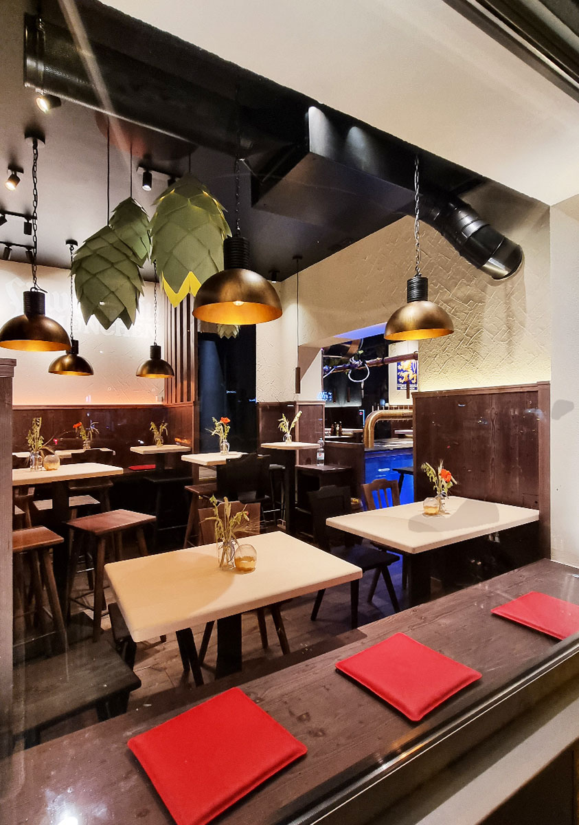 Der Entwurf begeistert mit warmen Brauntönen, coolen Dunkelblau-Nuancen und dem ikonischen goldenen Löwen auf hellblauem Grund. Das Herzstück des Designs: Drei große, dunkelblaue Biertanks, die über dem Tresen an schwarzen Stahlträgern schweben und durch farbiges Licht perfekt in Szene gesetzt werden. Freihängende, sichtbare Leitungen transportieren das frische, kühle Bier in den messingfarbenen Schankbalken.